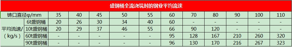 最大的條件下,應(yīng)能提供所需要的最大澆注速度。表三列出了全流澆注時不同容量盛鋼桶采用不同直徑鑄口(單鑄口)時的鋼液平均流速,可供參考。