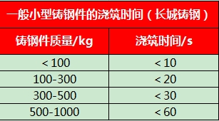 澆注小型鑄鋼件(≤1000kg)時,一般用澆注時間來衡量澆注速度的快慢。澆注一般小型鑄鋼件的澆注時間可參見表一: