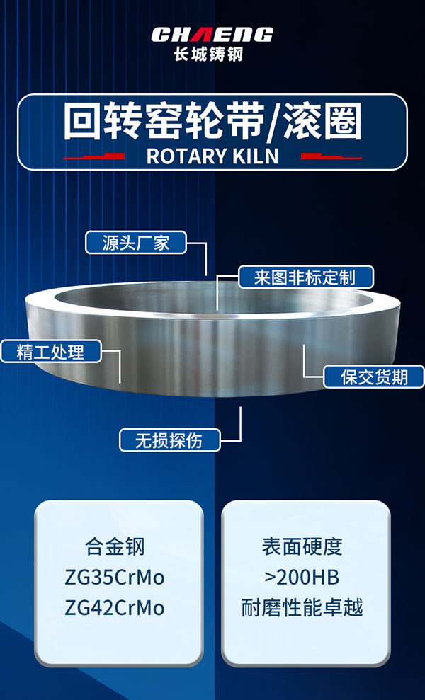 回轉(zhuǎn)窯輪帶是回轉(zhuǎn)窯設(shè)備的關(guān)鍵部件,又稱滾圈,主要作用是將筒體重力傳遞給托輪并保障回轉(zhuǎn)平穩(wěn),同時通過加強筒體徑向剛度維持結(jié)構(gòu)穩(wěn)定性?;剞D(zhuǎn)窯輪帶通常使用的是優(yōu)質(zhì)合金鋼ZG35CrMo或者ZG42CrMo,ZG35CrMo是一種鉻鉬合金鋼,具有高強度、高韌性及良好的高溫性能,適用于重載和高溫環(huán)境下的關(guān)鍵部件制造,而ZG42CrMo是一種中碳調(diào)質(zhì)高強鋼,具有高強度、高韌性及良好淬透性,兩種材質(zhì)均適合回轉(zhuǎn)窯輪帶/滾圈的鑄造和使用。