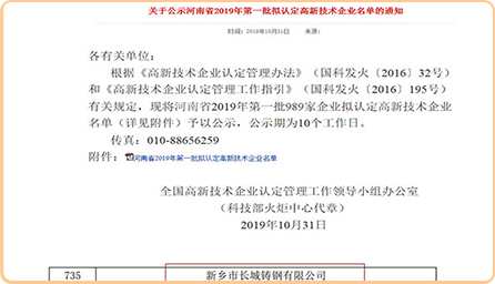 在這一年,長城鑄鋼先后亮相了第十七屆中國國際鑄造博覽會并獲優(yōu)質(zhì)鑄件金獎、德國杜塞爾多夫國際冶金鑄造展、第二十一屆上海國際冶金工業(yè)展覽會,為公司品牌知名度再添風(fēng)采。公司在今年取得了“河南省科技小巨人培育企業(yè)”證書、順利通過國家科技中小企業(yè)評價(jià)并登記入庫、順利當(dāng)選中國鑄造協(xié)會鑄鋼工作委員會的理事會成員、通過2019年度第一批國家高新技術(shù)企業(yè)評審......
